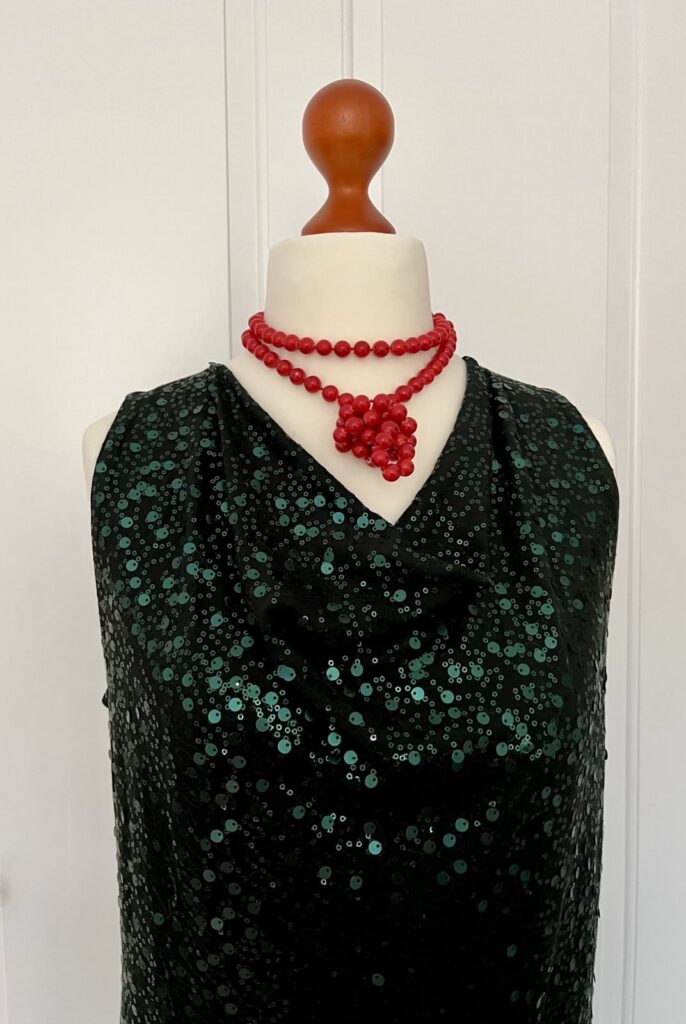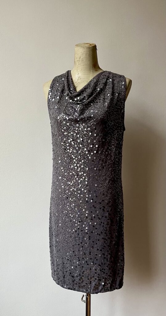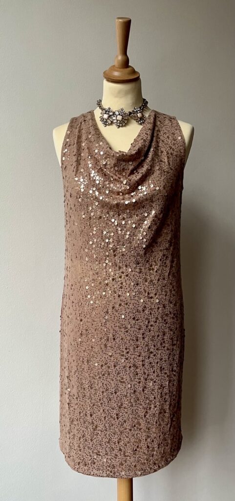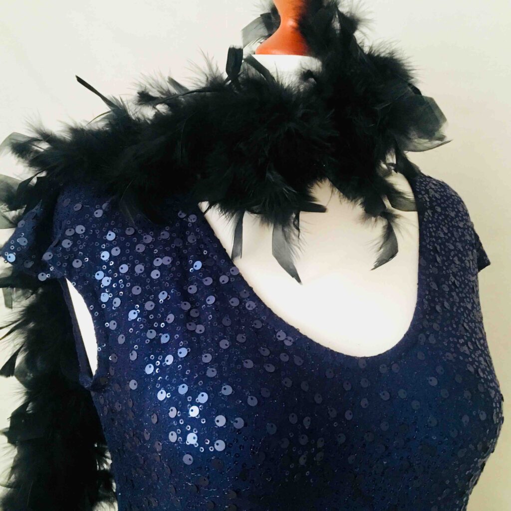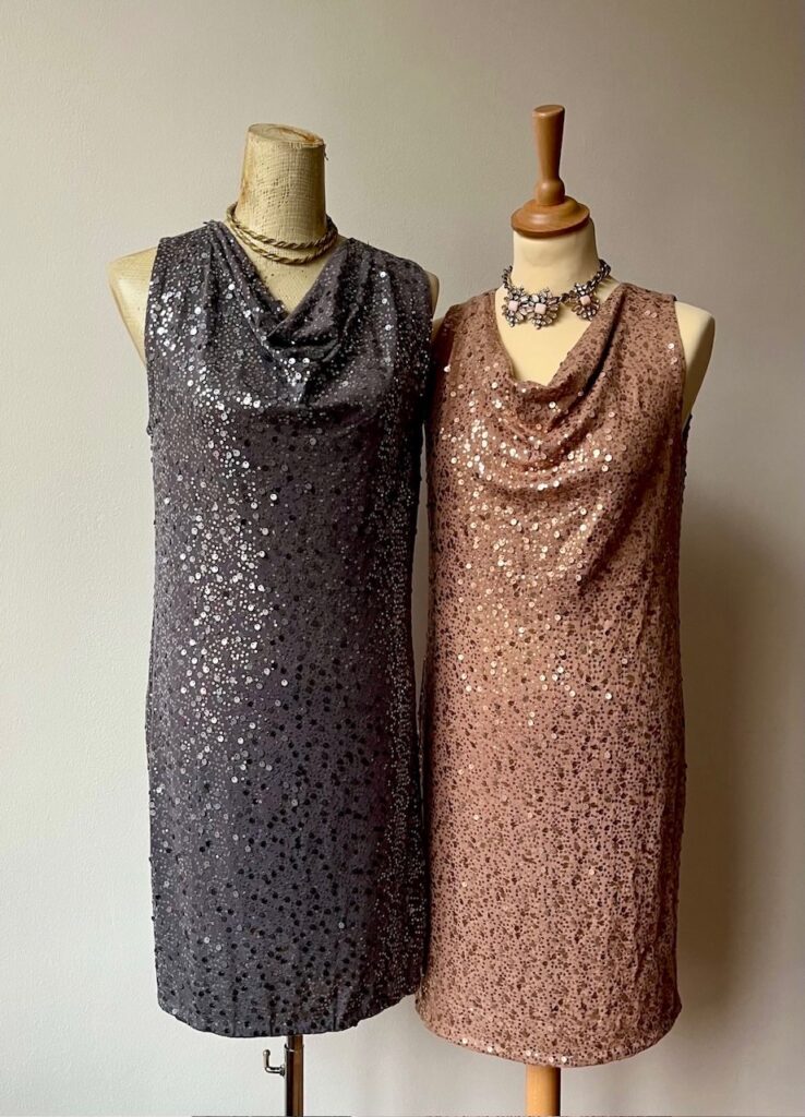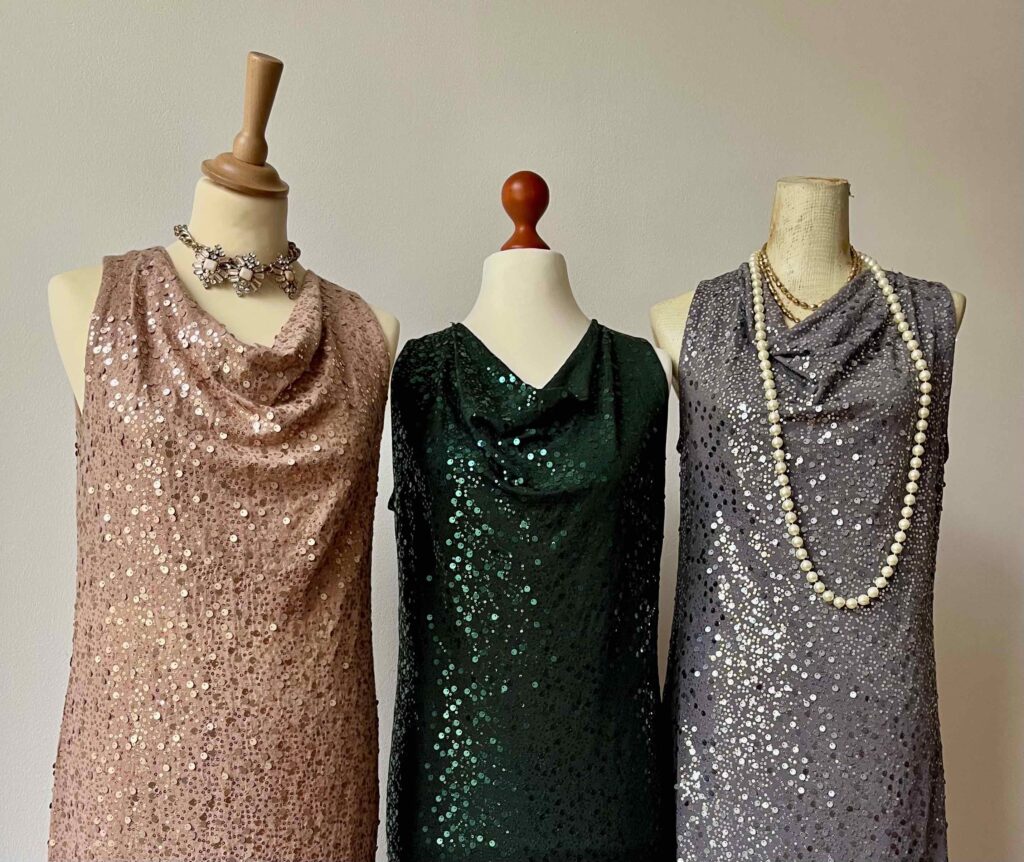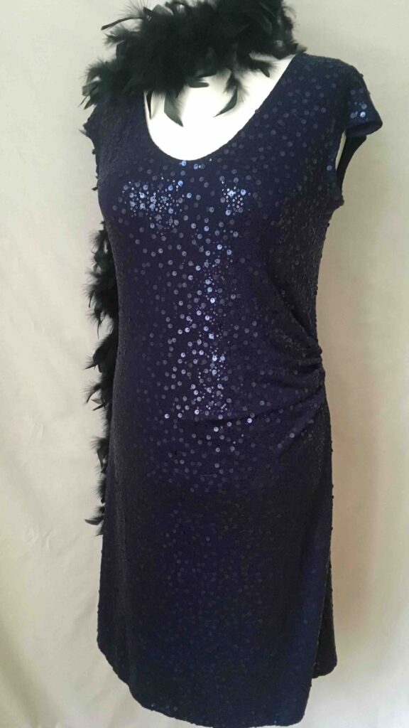 Die Paillettenkleider und -oberteile gibt es in Gold, Silber, Schwarz, Blau, Rot und Grün und in den verschiedensten Schnitten und Größen (hier bis 46). Gerne auf Auftrag.